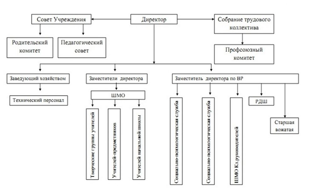 Управление школой осуществляется на основе сочетания принципов самоуправления коллектива и единоначалия. Структурно-функциональная модель школы создана с учетом типа образовательного учреждения, его специфики и задач, стоящих перед образовательным учреждением с целью эффективного и результативного выполнения государственного и социального заказа. Сложившаяся модель структурных подразделений соответствует функциональным задачам школы. Все структурные подразделения выполняют основные задачи, определенные образовательной программой школы.